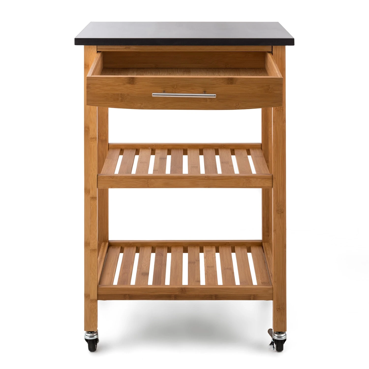 Ein Platz für alles: Auf vier Etagen bringst du im Klarstein Tennessee Servierwagen Geschirr, Vorräte, Flaschen, Besteck und Küchengeräte gut geordnet unter. Dafür sorgen die große Arbeitsplatte, zwei Lattenrost-Ablagen sowie die topseitige Schublade. Zum Anrichten stehen dir gleich 2320 cm² auf der edlen Arbeitsplatte aus Granit zur Verfügung, um fertige Speisen an den Tisch zu fahren oder dort direkt vorzubereiten. Dank Hartgummirollen gleitet der Servierwagen leichtgängig sogar über Teppichböden. So verrichtet der Küchenbutler freudig seine Dienste als Anrichte oder Beistelltisch.